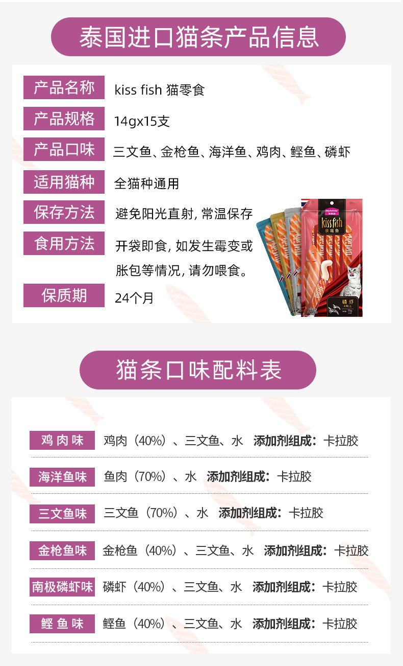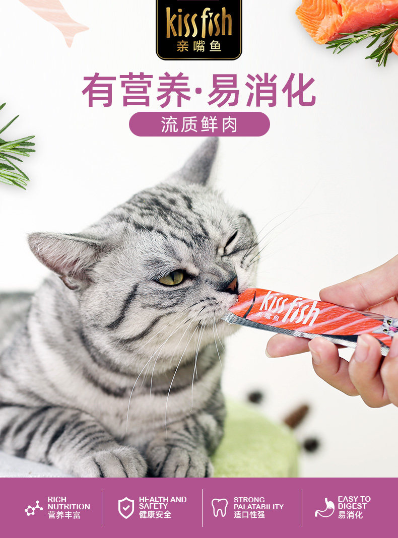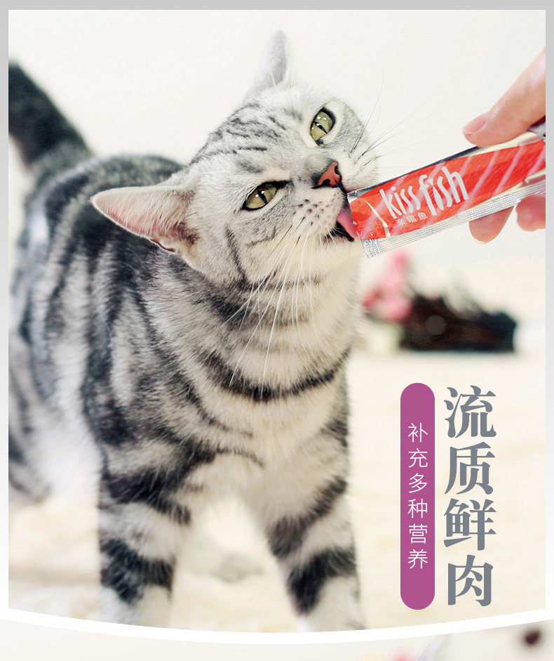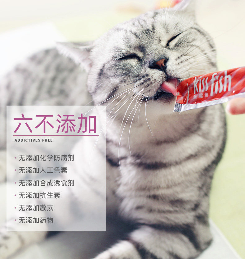 流质鲜肉,补充多种营养,营养丰富, 健康安全,适口性强,易消化; 选用泰国新鲜鱼肉,独立小包装,喂食方便 6不添加(无添加化学防腐剂、无添加人工色素、无添加合成诱食剂、无添加抗生素、无添加激素、无添加药物)