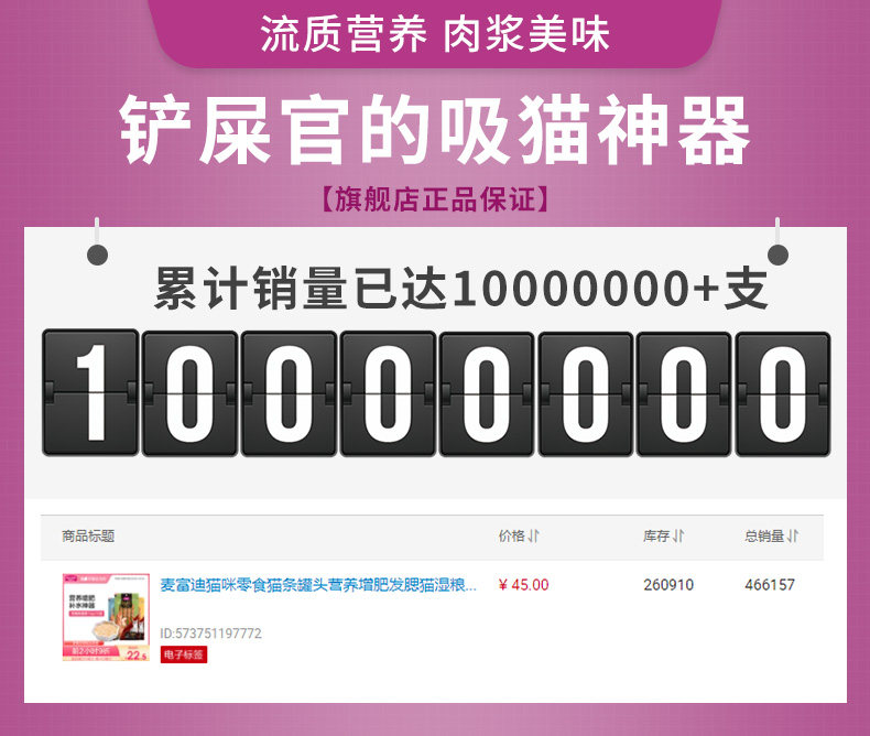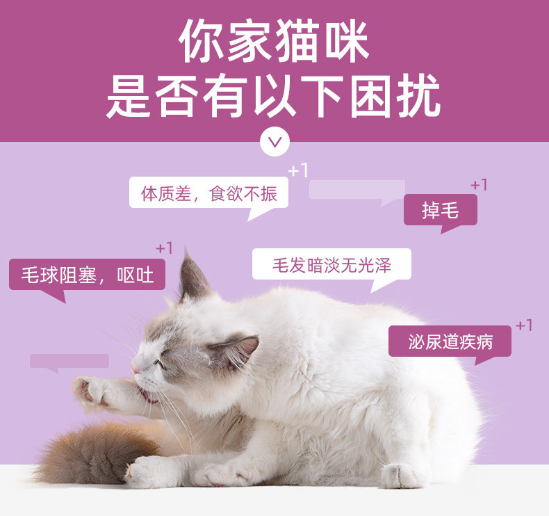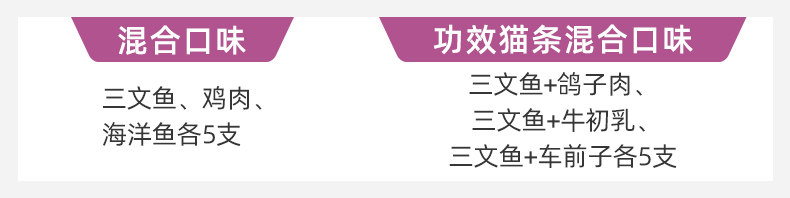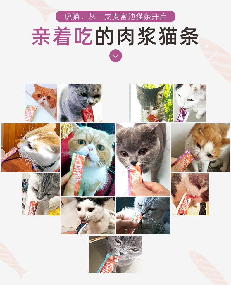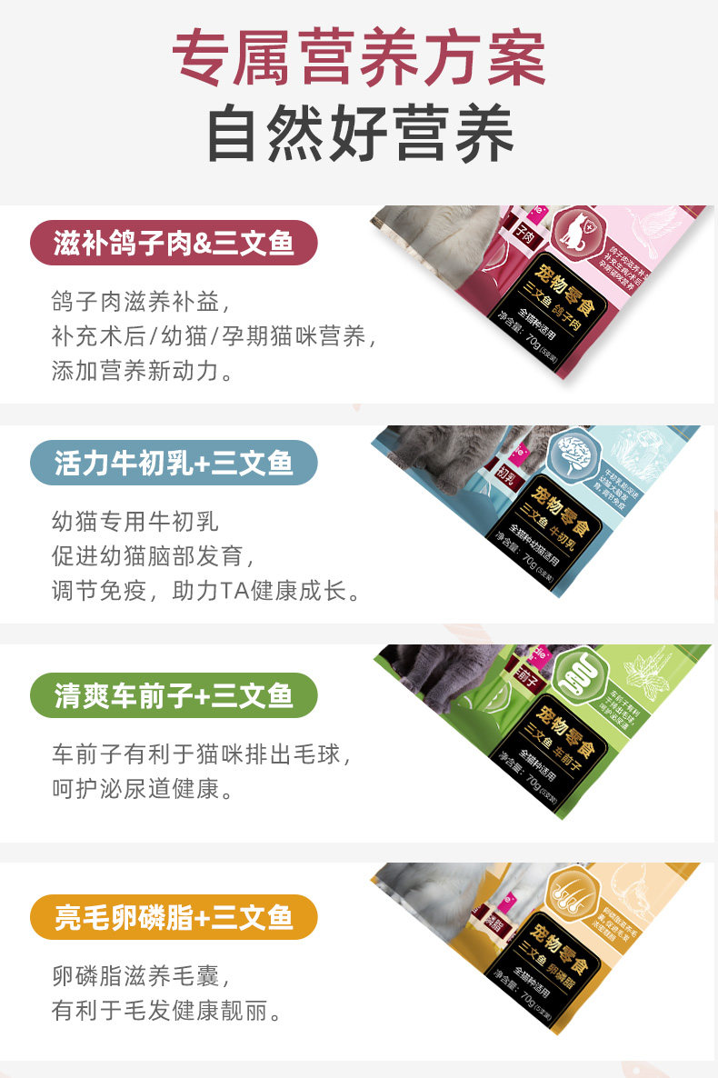 流质鲜肉,补充多种营养,营养丰富, 健康安全,适口性强,易消化; 选用泰国新鲜鱼肉,独立小包装,喂食方便 6不添加(无添加化学防腐剂、无添加人工色素、无添加合成诱食剂、无添加抗生素、无添加激素、无添加药物)