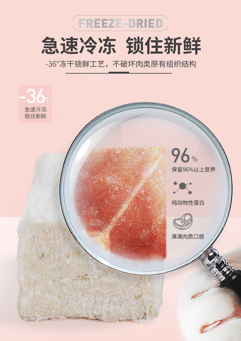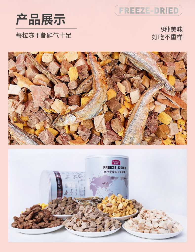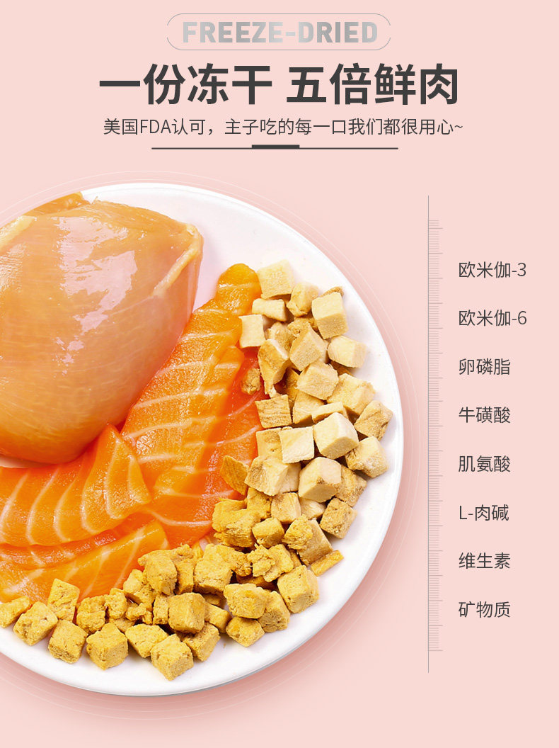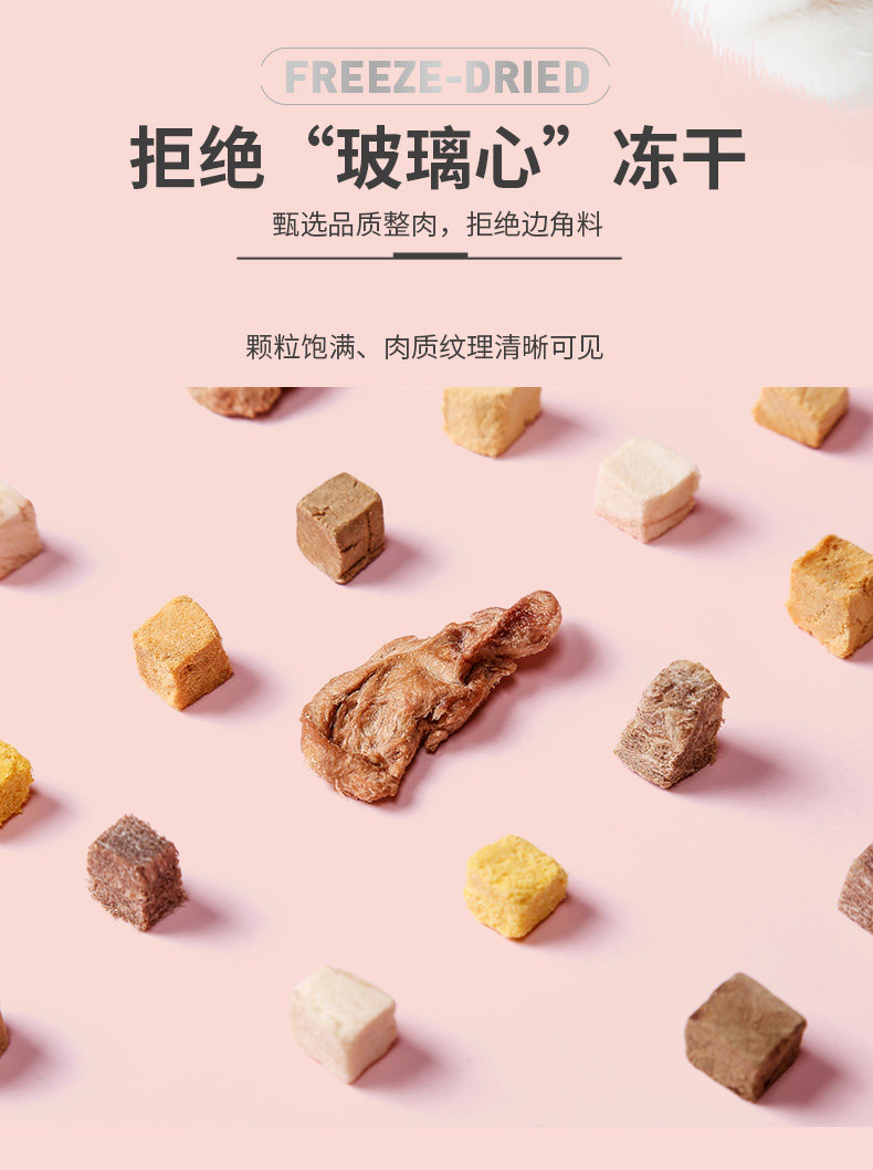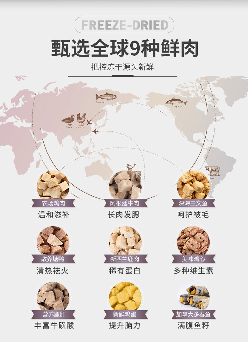 9中冻干,美味全满足;甄选全球9种鲜肉; 一份冻干,五倍鲜肉,急速冷冻,锁住新鲜,遇水还原,鲜肉口感; 一粮三吃,搭配随心 真空冷冻干燥技术处理,蛋白质和其他脂溶性维生素(VA、VD)损失为0%