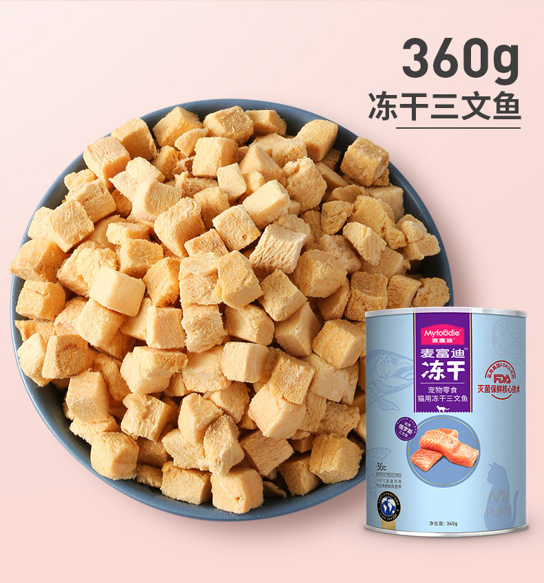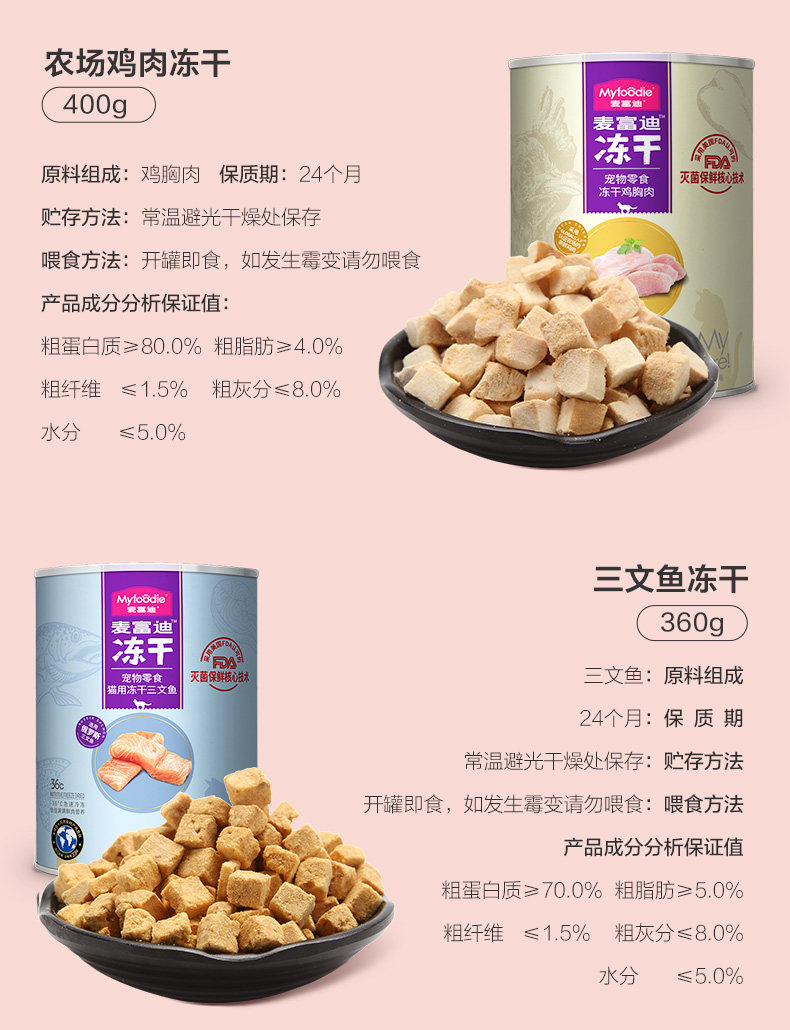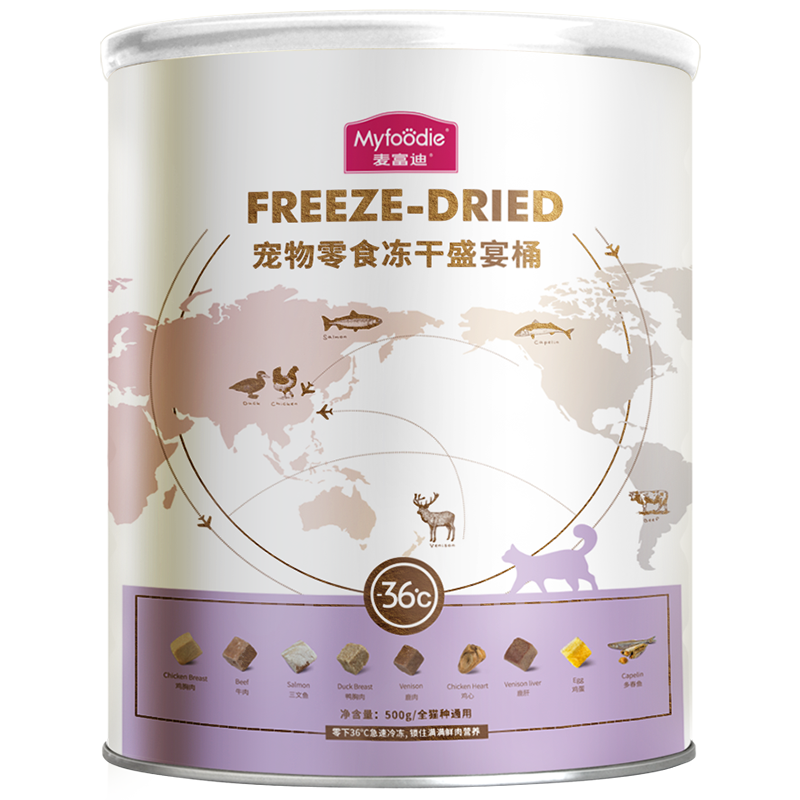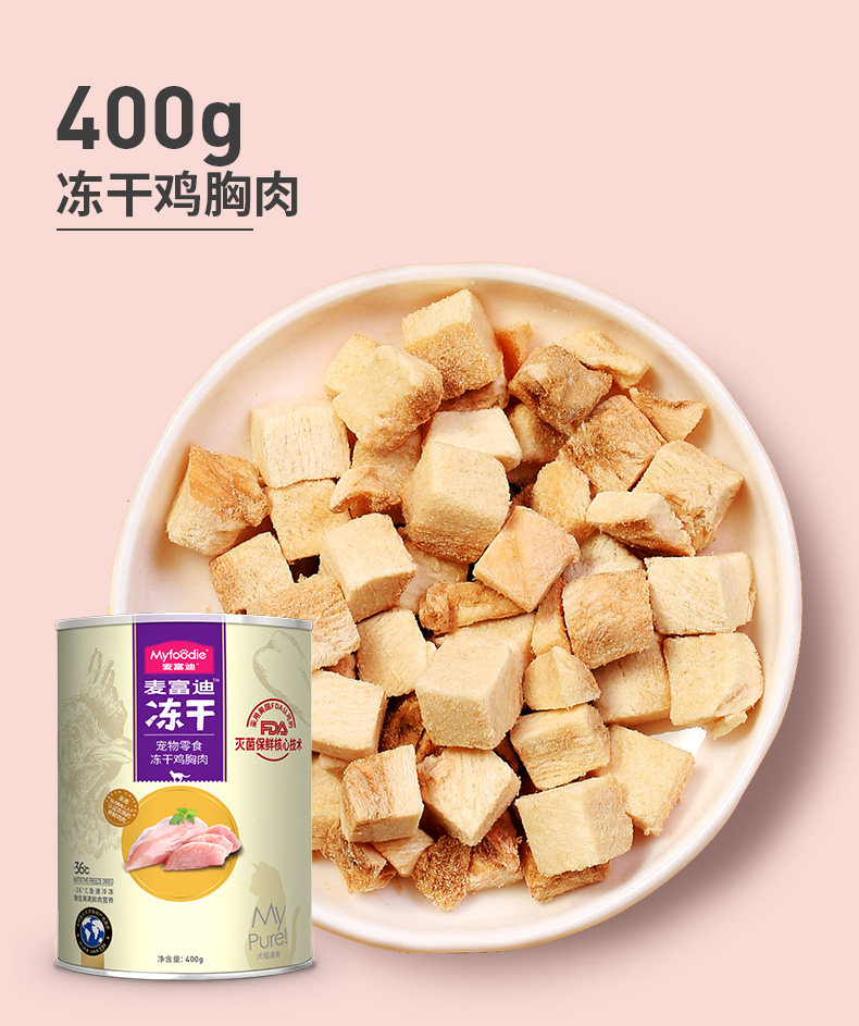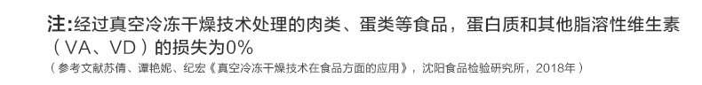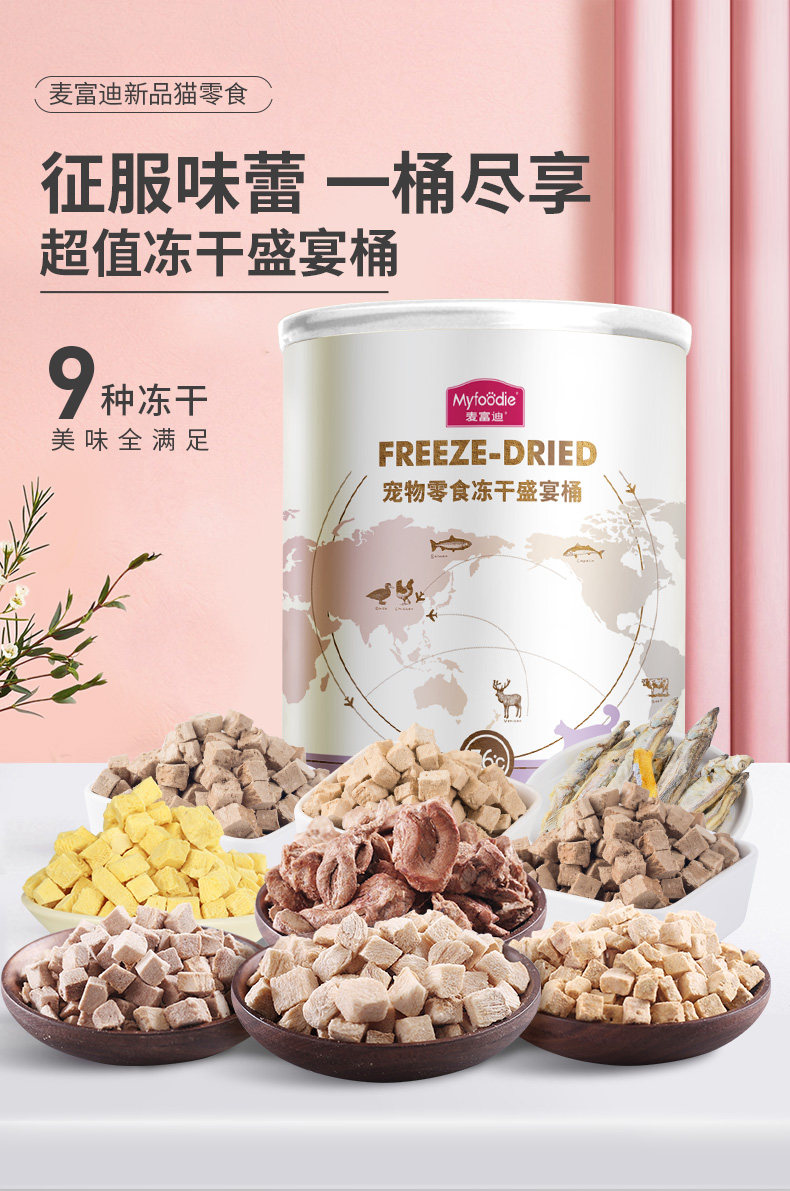 9中冻干,美味全满足;甄选全球9种鲜肉; 一份冻干,五倍鲜肉,急速冷冻,锁住新鲜,遇水还原,鲜肉口感; 一粮三吃,搭配随心 真空冷冻干燥技术处理,蛋白质和其他脂溶性维生素(VA、VD)损失为0%