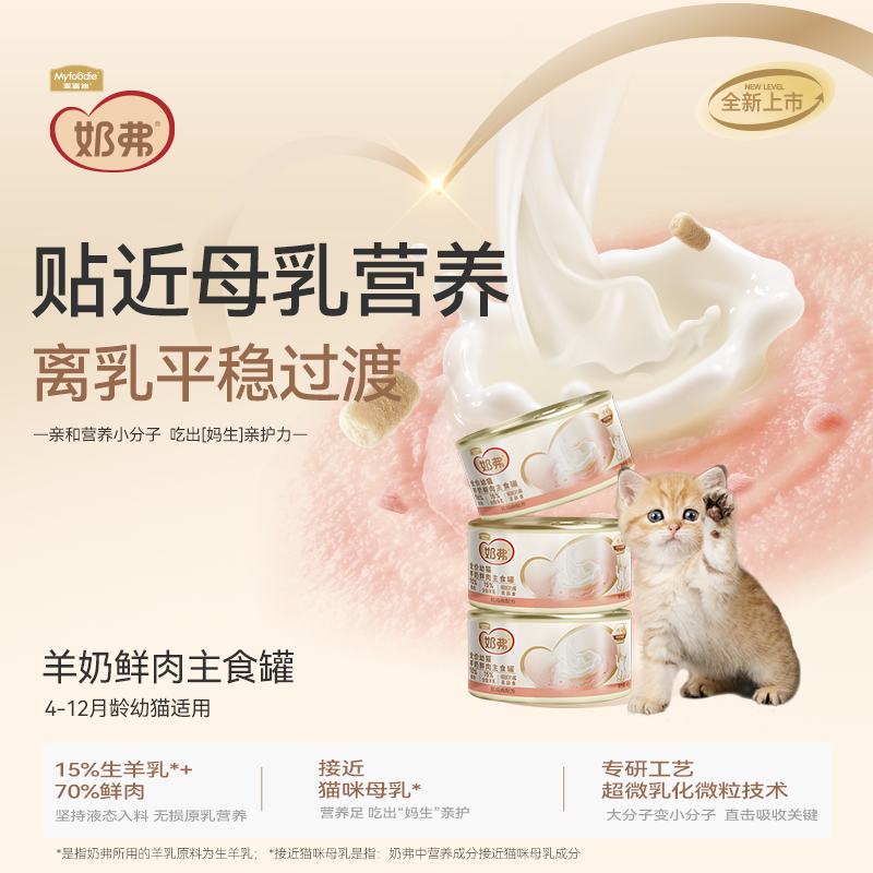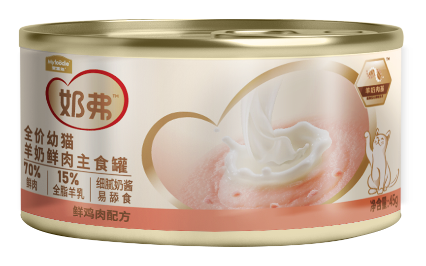 幼猫主食罐15%生羊乳(液态入料)+70%鲜肉,羊奶肉基打底,2大原生营养双重补充,延续母乳喂养保护;融合超微乳化微粒技术,大分子变微粒小分子,提升猫粮的消化吸收率;同时奶弗幼宠系列,选取保藏猫乳中有助肠道及免疫的菌株,形成母乳菌群,呵护猫咪茁壮健康成长。奶弗主食罐,采用三级营养乳化工艺,确保奶肉营养更细腻,易舔食易吸收~