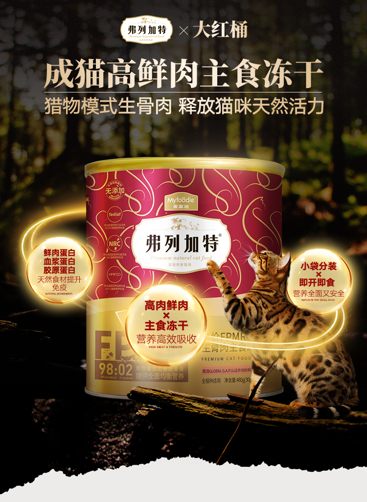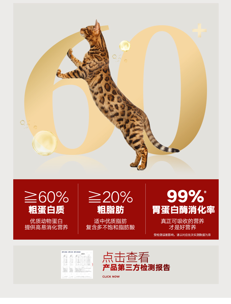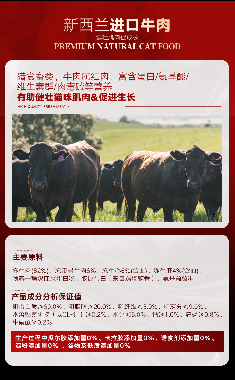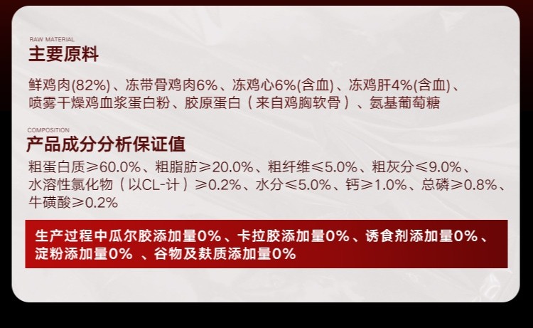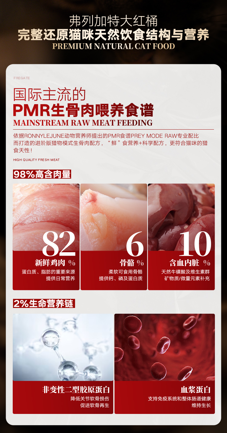 98%生骨肉含量,食谱配比含肌肉、生食用骨及内脏,天然高适口性;蛋白含量高达60%,离乳期幼猫专研配方 牛初乳:高免疫 磷虾油:呵护心脑健康 五色莓果:抗氧,抗应激 ;100%动物蛋白,不含谷物,高易消化吸收,胃蛋白酶消化吸收率高达98.9%(三方报告)