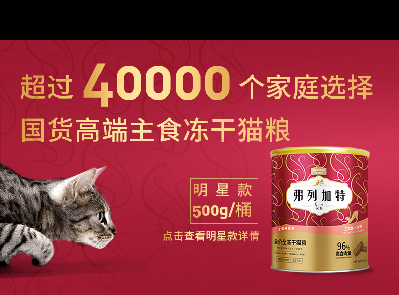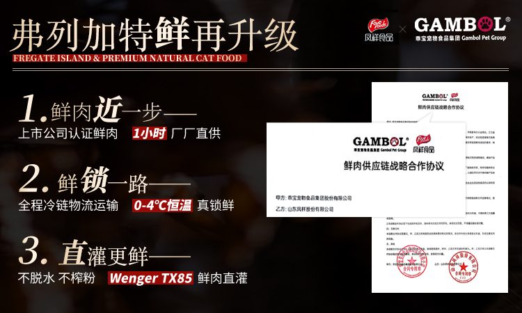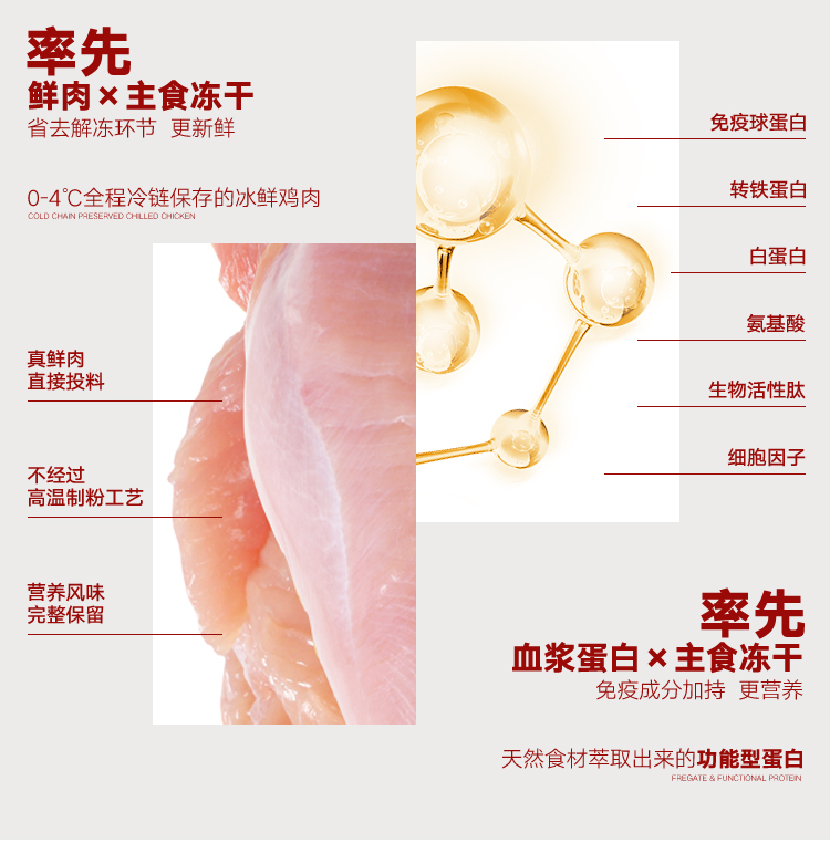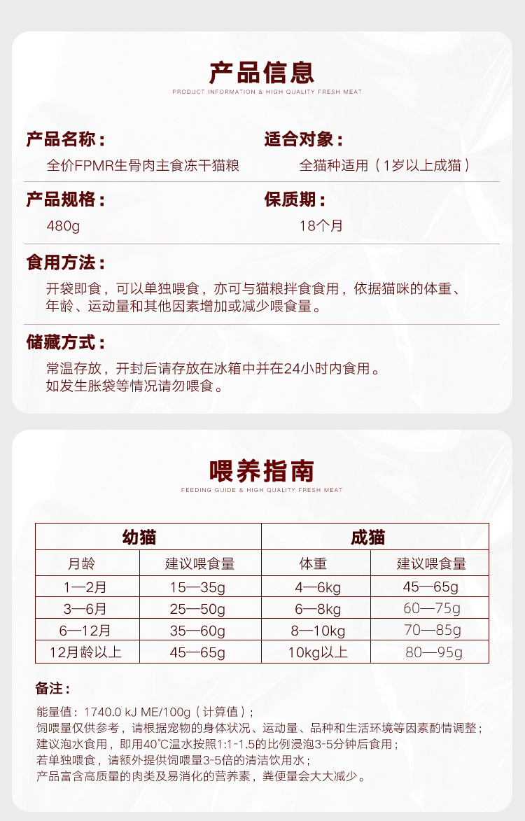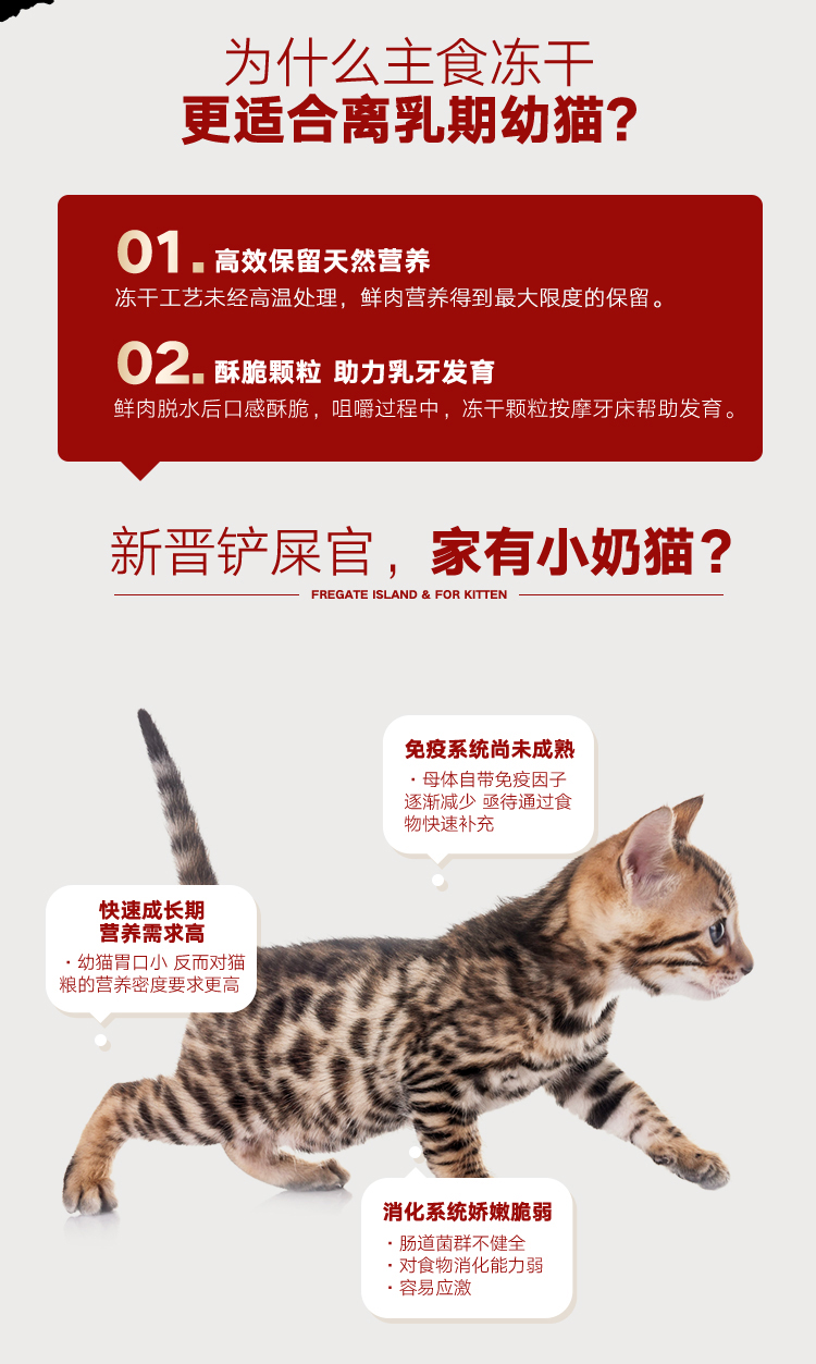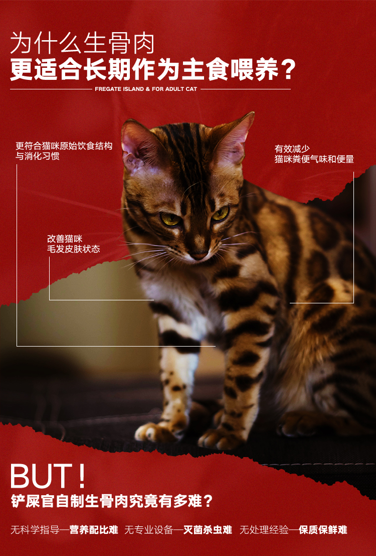 98%生骨肉含量,食谱配比含肌肉、生食用骨及内脏,天然高适口性;蛋白含量高达60%,离乳期幼猫专研配方 牛初乳:高免疫 磷虾油:呵护心脑健康 五色莓果:抗氧,抗应激 ;100%动物蛋白,不含谷物,高易消化吸收,胃蛋白酶消化吸收率高达98.9%(三方报告)